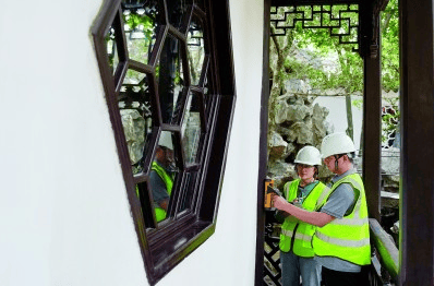 工作人员在苏州狮子林采集园林建筑信息数据,构建苏州古典园林要素数据库(新华社 发)